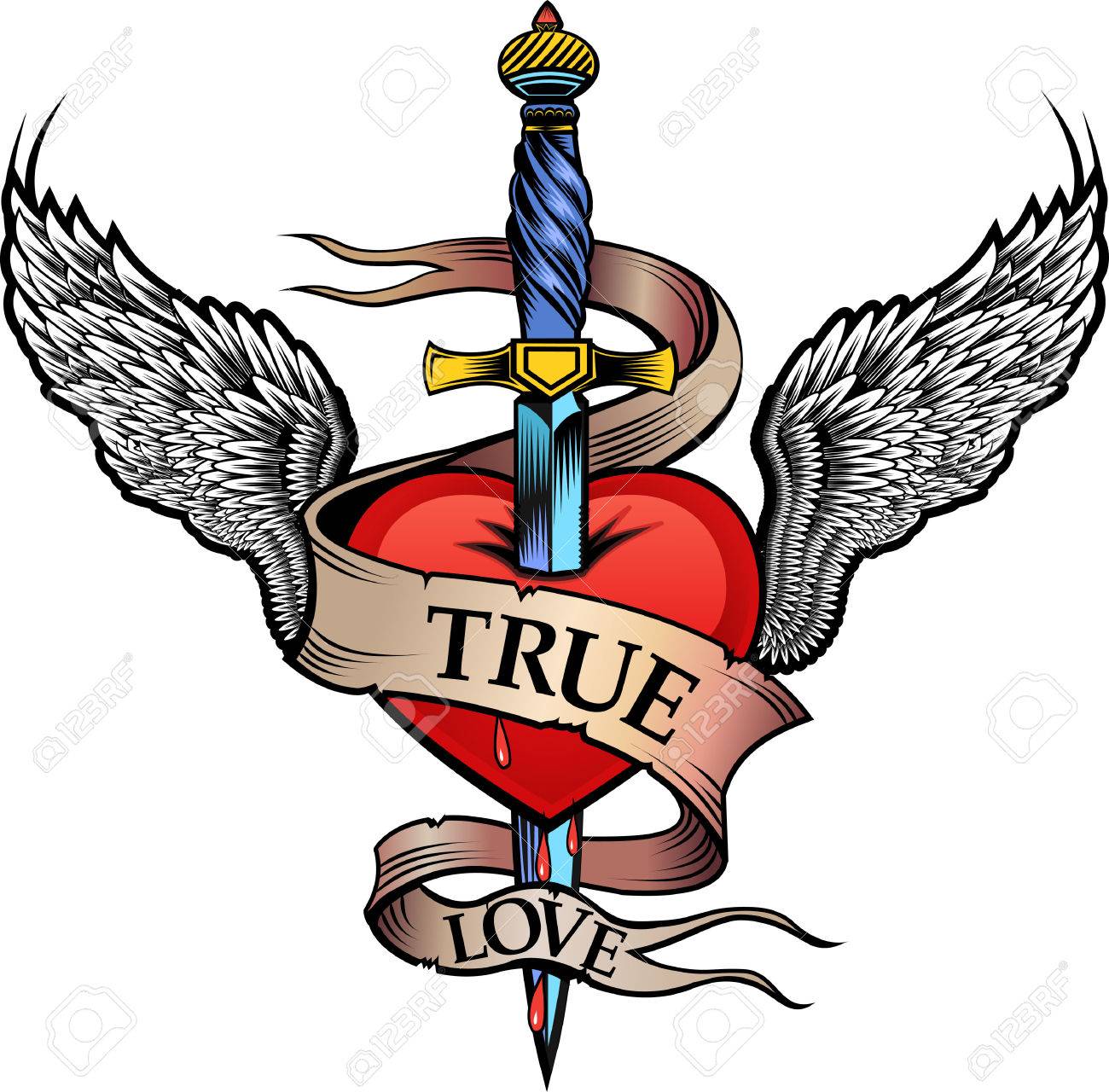164604341 stock photos online. Illustration about The illustration depicts a heart pierced with a dagger and text. Heart with sword and wings in retro style for tattoo design - heart with sword and wings Vector by Seamartini.